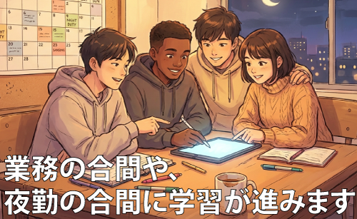 学習の柔軟性 | いつどこでもスマホで学習可能 (動画で見てテキストで確認) | 教材がある場所のみ (テキスト型なので学習意欲必須) | 決められた場所・時間のみ (学習意欲のある職員に不向き) |