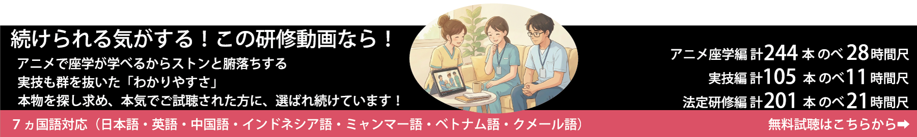 動画でOJT介護では、ICFを理解するため、「林さん」という登場人物の人生を振り返りストーリー化しています。認知症の中核症状を理解するため、会話形式を導入しています。交感神経を副交感神経の関係を理解するために「鹿の本能」をストーリーとして学び、イメージで理解できる工夫を凝らしています。バイスティックの7原則の「非審判的態度」は、職員とご利用者様の会話の中で自然に学べるよう工夫がなされています。このように全231本(のべ時間30時間)、すべてに「乾いたスポンジが水を吸収するかのように笑いながら理解」できるような、一貫したゆるぎない創意工夫がなされています。