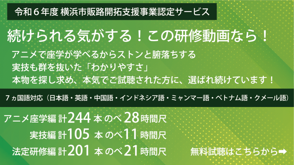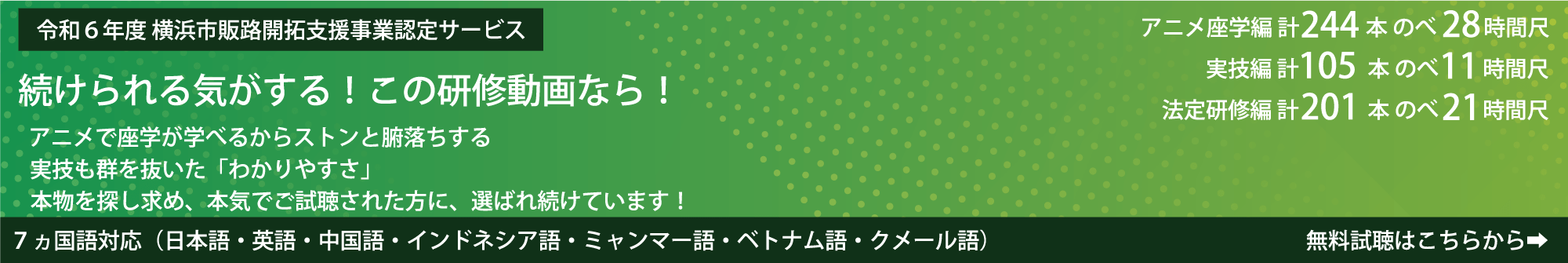 法動画でOJT介護法定研修ダイジェスト版では、以下のタイトルの動画の一部を抜粋抽出部分がご視聴いただけます。