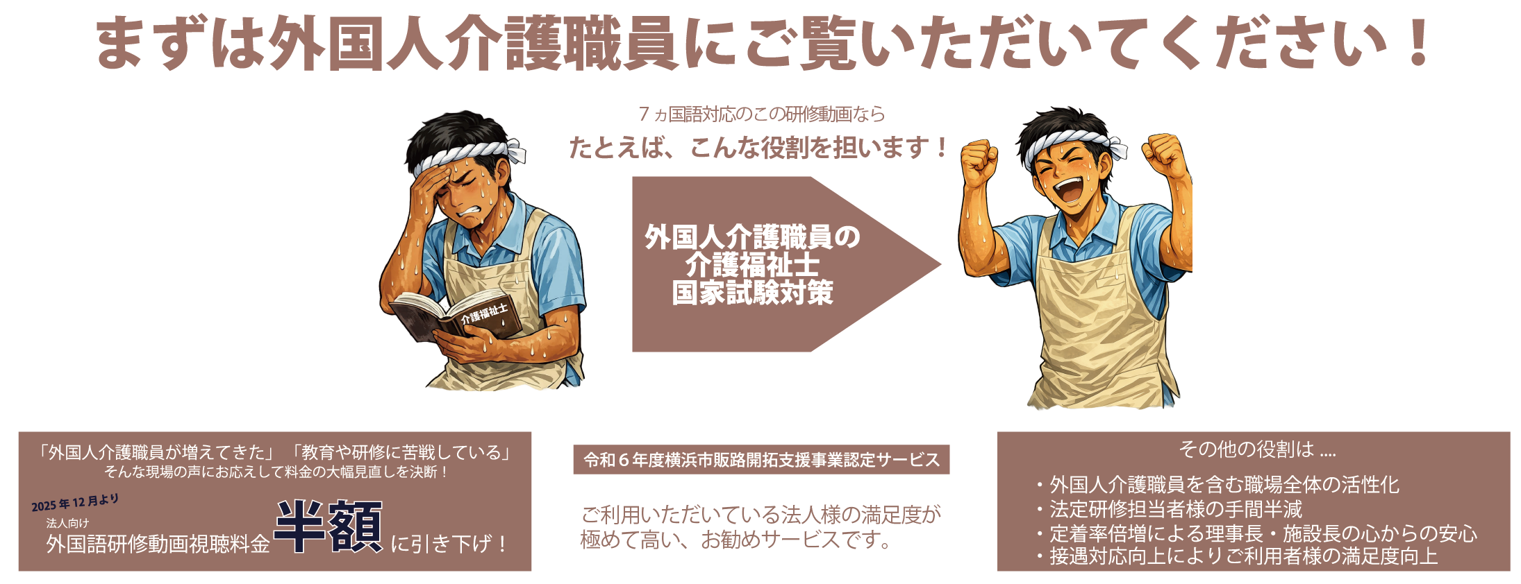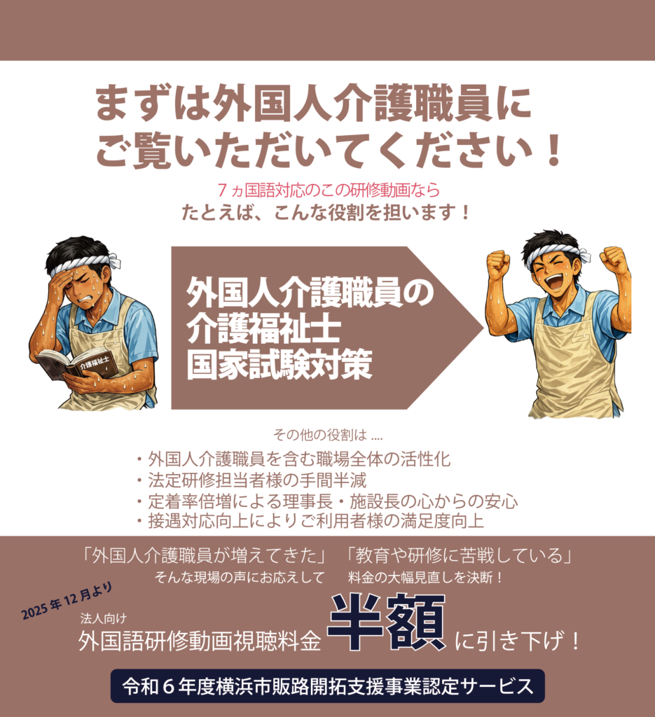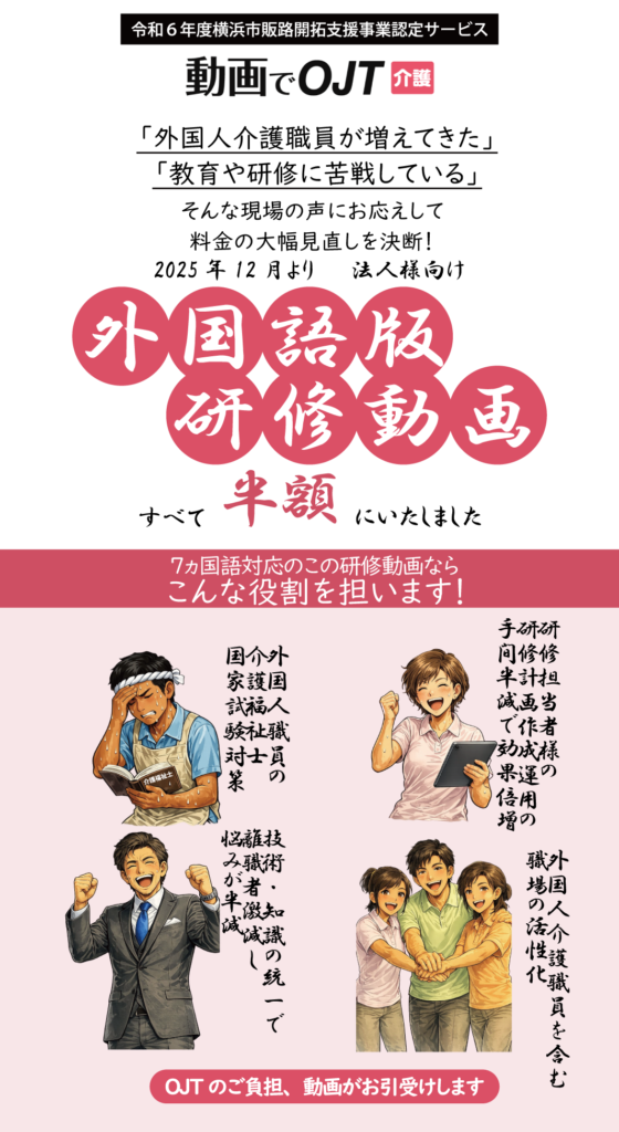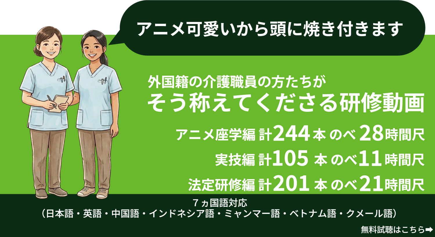 多言語対応 | 日本語・英語・ベトナム語・ミャンマー語・インドネシア語・クメール語等 | 日本語のみが多い (外国語版があっても翻訳の品質に難) | 通訳が必要 (介護業界の専門用語等の訳出に難) |