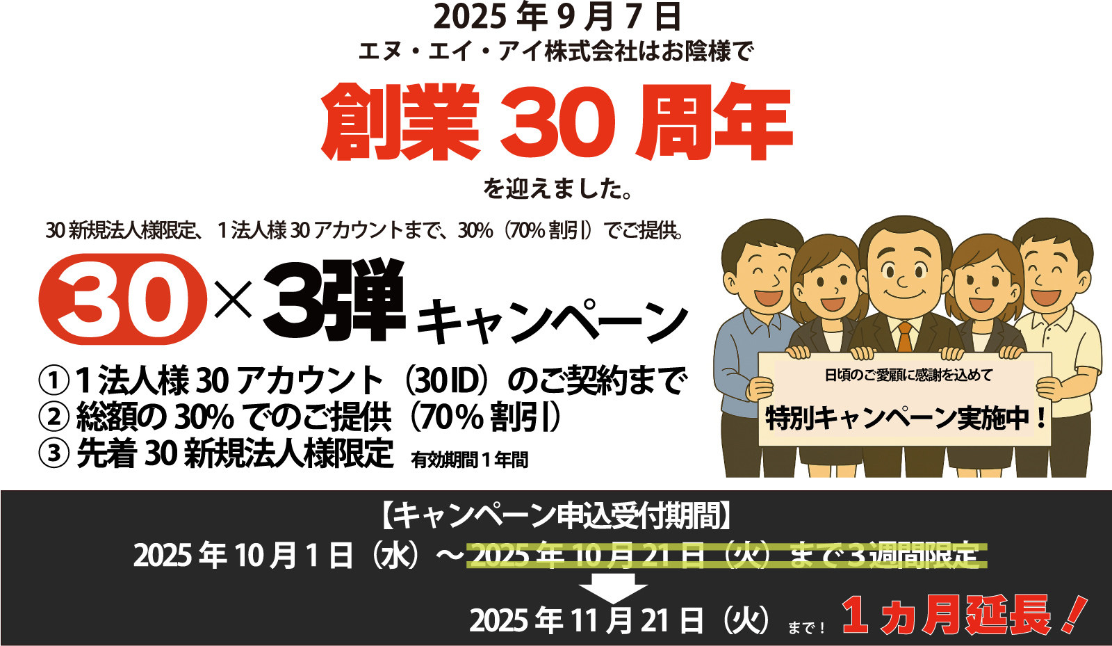 創業30周年の特別企画です。従いまして、先着30新規法人様限定での受付とさせていただきます。