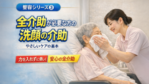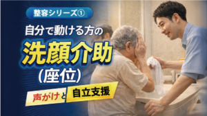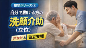 全介助が必要な方の洗顔の介助 1. “やさしさ”が技術になる整容ケア 整容ケアの中でも、全介助が必要な方の洗顔は、特に丁寧さと配慮が求められるケアです。 自分で動ける方への介助と異なり、介護職員の手の動き、力の入れ方、声 […]