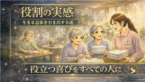 「役割」の実感 1. 人は誰かの役に立つことで、生きる力を取り戻す 介護において見落とされがちな重要な視点があります。それは、ご利用者様が「誰かの役に立っている」と実感することです。 本動画「役割の実感」では、施設長と介 […]