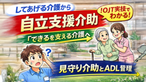 実技編|自分で動ける方の洗顔介助(座位) 1. 声がけで変わる「整容介助」の質 介護における整容は、単なる清潔ケアではありません。それは 尊厳・自立・コミュニケーション を支える基本ケアです。 今回の「動画でOJT介護 […]